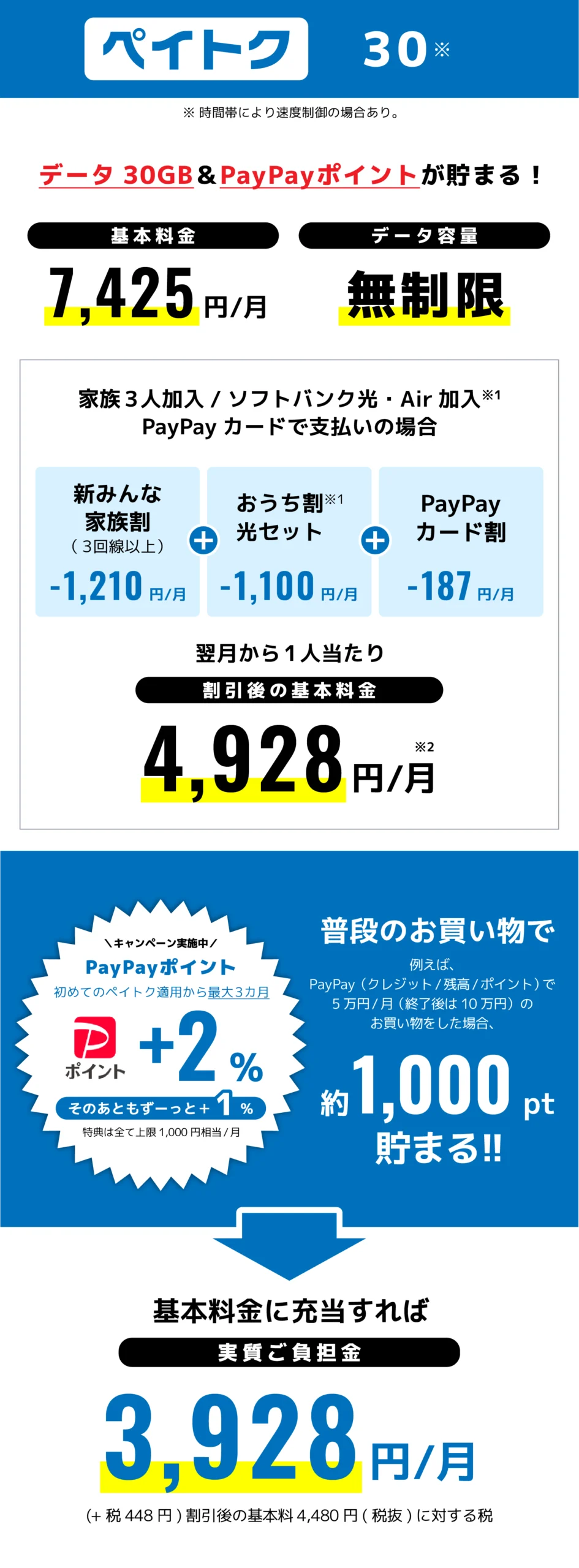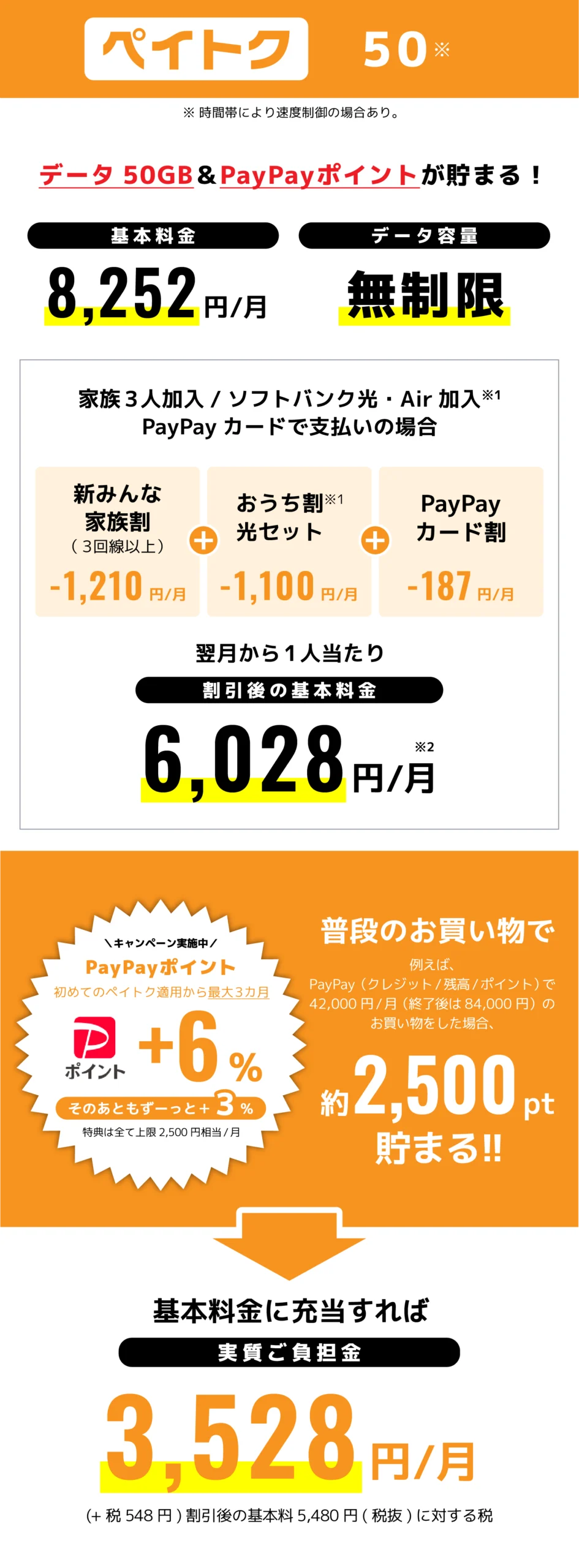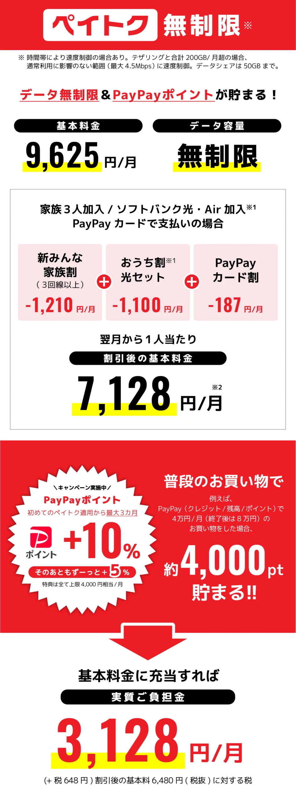 ●適用条件:請求締日時点で、PayPayカード又はPayPayカードゴールドが、ご利用料金のお支払い方法として適用されているとき。※家族カードも対象です。●請求代行サービスを利用している場合、適用されません。●割引対象データプランの定額料が日割となる場合、本割引サービスの割引額は日割となります。●「電話番号・メールアドレスお預かりサービス」に加入した場合等は、前請求月で割引は終了します。
