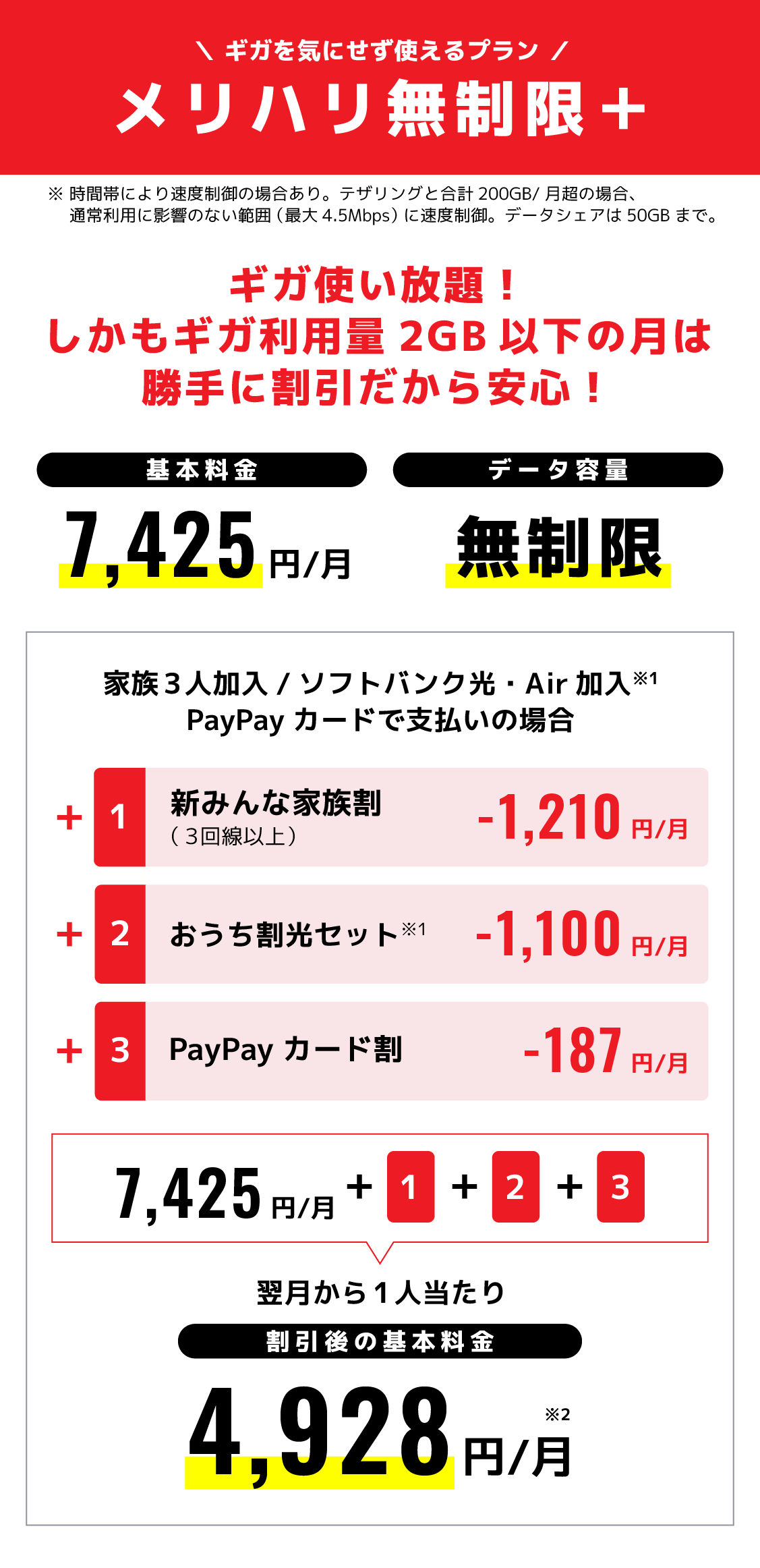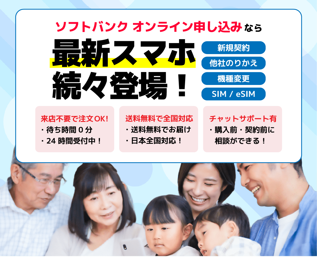 ●3G 専用機種など一部対象外機種があります。●テザリング・データシェアでのご利用のデータ量が合計50GB/月を超えた場合、請求月末まで通信速度を送受信時最大 300Kbps に低速化いたします。●SMS、海外でのご利用分などは対象外です。●ソフトバンクを既にご利用中のお客さまが申し込みする場合は、翌請求月から適用されます(一部異なる場合があります。詳しくは提供条件書をご確認ください)。●加入月に解約する場合を除き、解約月の定額料は日割計算しません。●ご利用のデータ量が 2GB 以下の場合の割引は、日割計算します。●スマホ通信で 200GB/月を超えた場合の通信速度制御は追加データをチャージ(購入)いただいても通常速度に戻りません。●余ったデータ量を翌請求月以降に繰り越して利用することはできません。●ネットワークサービスの安定的な提供のため、時間帯により、動画、ゲーム等のサービス、AR(拡張現実)等の機能を用いたサービス、その他トラヒックの混雑を生じさせるおそれのあるサービスのご利用にあたり 、通信速度を制御することがあります。●通信が混雑し、または通信の混雑が生じる可能性がある場合、ネットワーク全体の品質を確保するため、通信の種類および内容にかかわらず、 通信速度を制御することがあります。●テザリング以外の通信でも環境・技術的な要因等によってテザリングとしてデータ通信量がカウントされる場合があります。●家族データシェア・法人データシェアは対象外です。